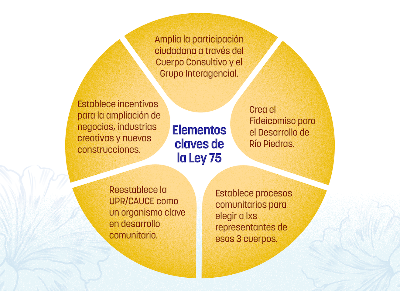 La Ley Especial para la Rehabilitación de Río Piedras, Ley Núm. 75 del 5 de julio de 1995 tiene el propósito de promover la revitalización y rehabilitación del centro urbano más importante en Puerto Rico: nuestro amado Río Piedras. Desde su aprobación en 1995, ha tenido cuatro enmiendas, y en esos procesos la comunidad se fue insertando para defender los derechos de lxs residentes de Río Piedras. Una de esas enmiendas tuvo la intención de eliminar de la Ley 95 -1995 las pocas instancias de participación ciudadana que esta tenía. Impulsada por el municipio de San Juan, esta enmienda tenía el propósito de poner en manos de la administración municipal todo lo relacionado con la rehabilitación del centro urbano de Río Piedras sin que la comunidad tuviera una participación informada, efectiva y real. Tales enmiendas iban de la mano con el funesto proyecto Río 2012 que contemplaba el desalojo de vecinxs de sus casas para la construcción de oficinas gubernamentales y servicios comerciales sin considerar su opinión.
